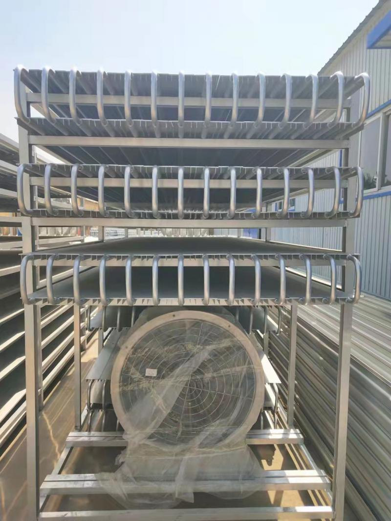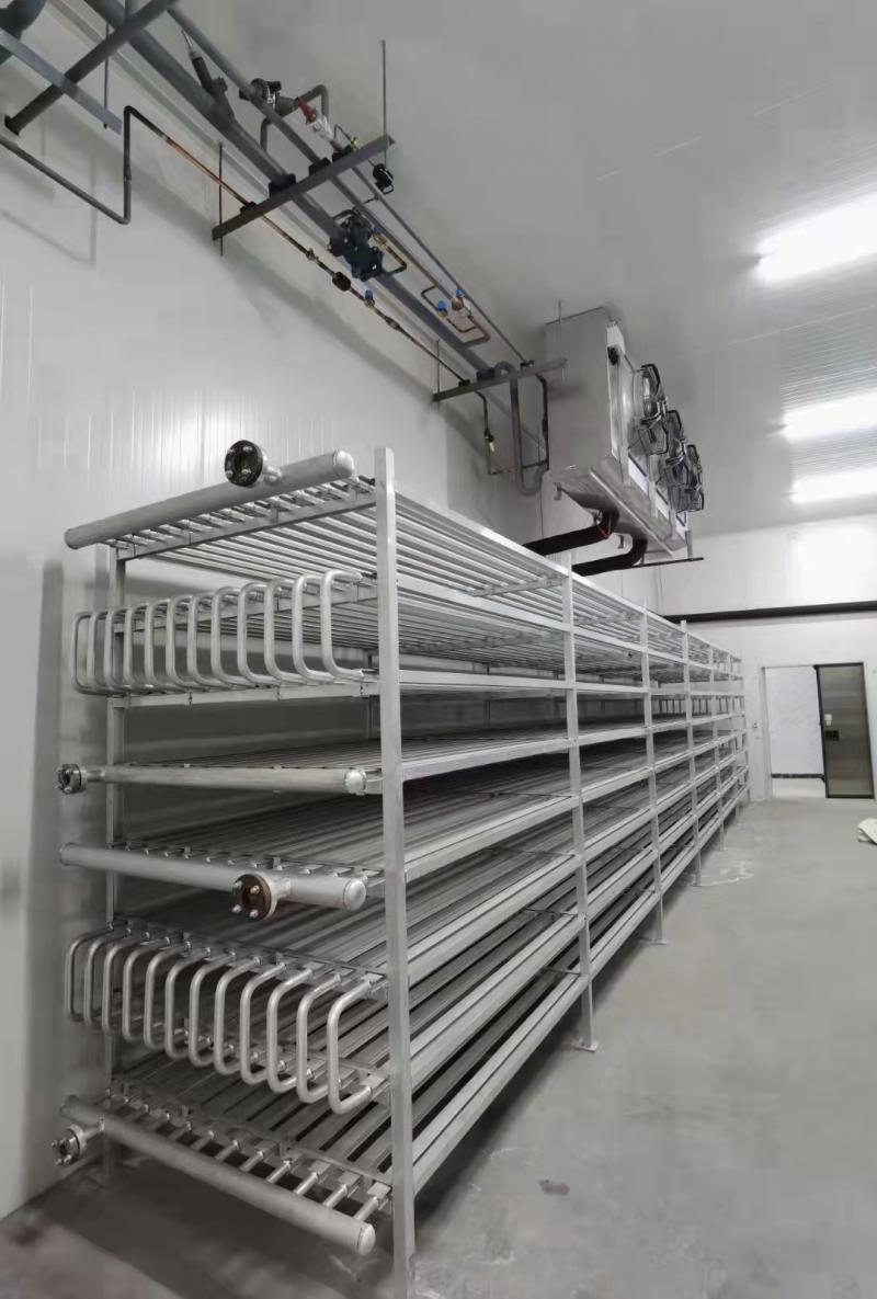 本實用新型公開了一種速凍間擱架,包括四根呈矩形排布的立柱,左右相鄰的兩根所述立柱之間穿插有連桿,前,后相鄰的兩根所述立柱之間穿插有第一連桿,所述連桿的外壁處開設(shè)有穿過所述第一連桿的孔,所述第一連桿的外部處焊接有擋板,所述擋板限位在所述立柱的內(nèi)側(cè),所述第一連桿穿過所述立柱的那一端螺紋連接有一螺母,在前,后設(shè)置的兩根所述立柱之間裝配有排架,所述排架上,下等距設(shè)置有多個,在所述排架的側(cè)面橫向貫穿設(shè)置有多個安裝孔,還包括U字形的銅制的導(dǎo)冷管,所述導(dǎo)冷管的兩端穿過兩側(cè)的排架;本產(chǎn)品可以利用冷媒直接與被速凍的食品接觸,增加冷凍效率.